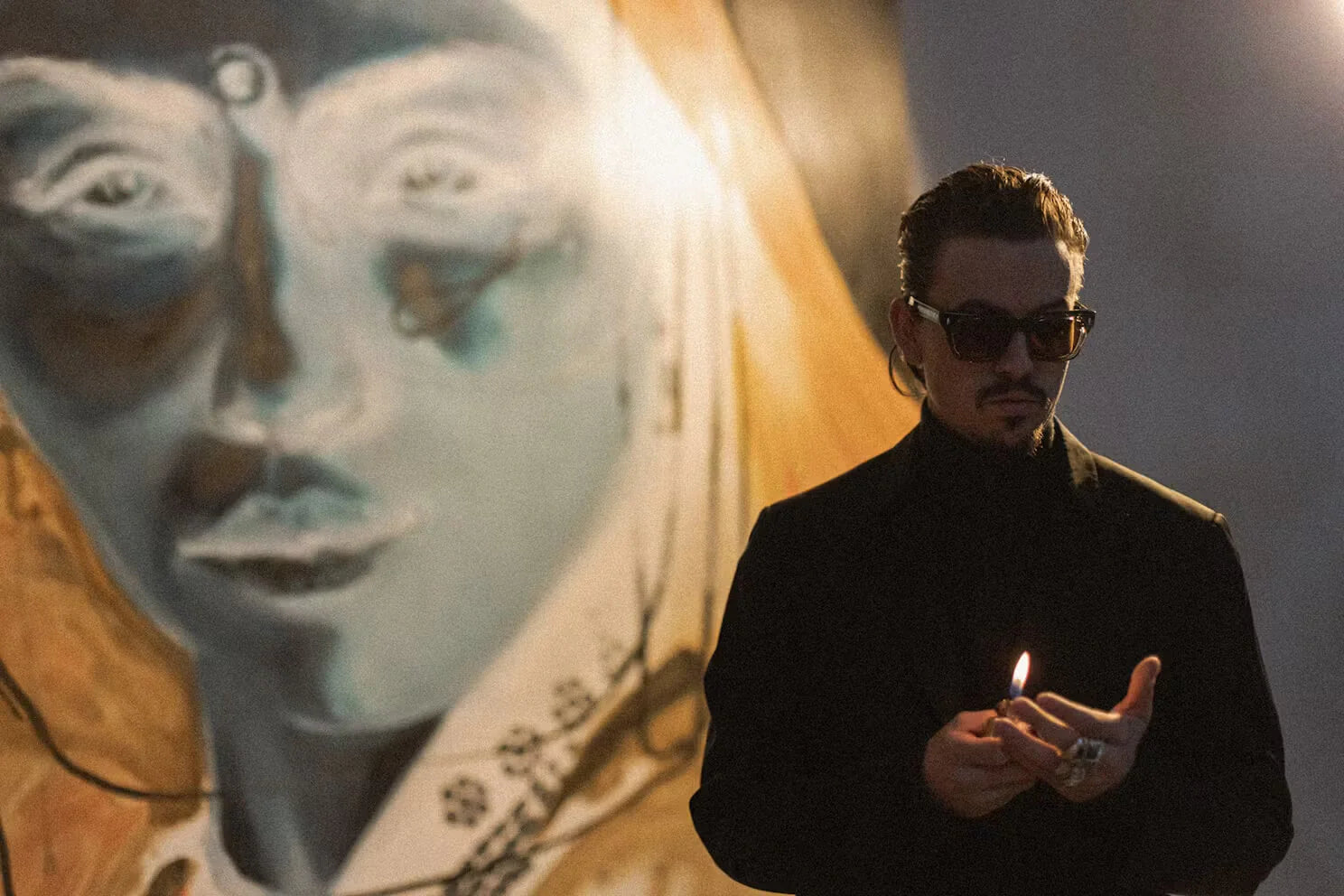 The Dealan has long served as a kind of ideological anchor for JMM—an eyewear archetype pulled from the golden age of counterculture and recast in limited runs of unapologetic modernity. For Tingley, the NUN series has carried an equally intimate weight: what began as a digital sketch evolved into drawings, then studies, then monumental paintings each rendered in negative color codes using over 22 layers of paint and a Renaissance-era technique called Sfumato. It’s a series about devotion, duality, and disruption. About what happens when memory paints itself in reverse.