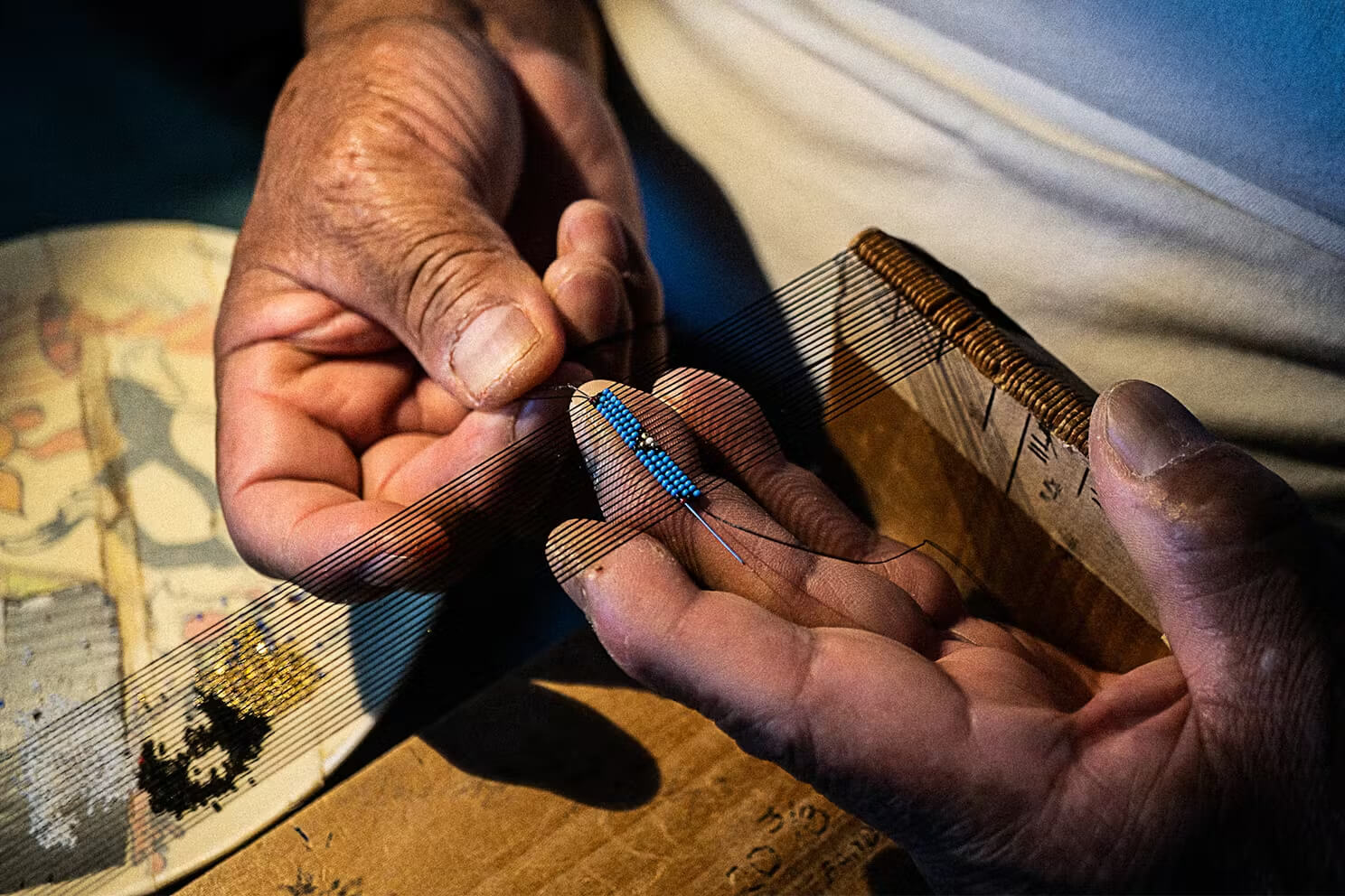 “My beadwork does the speaking for me,” he says, bent to his meditative toil. “As my great-grandfather used to say, ‘Think in harmony, speak in harmony, and therefore walk in harmony. Your endeavors will be blessed to have abundant life.’”