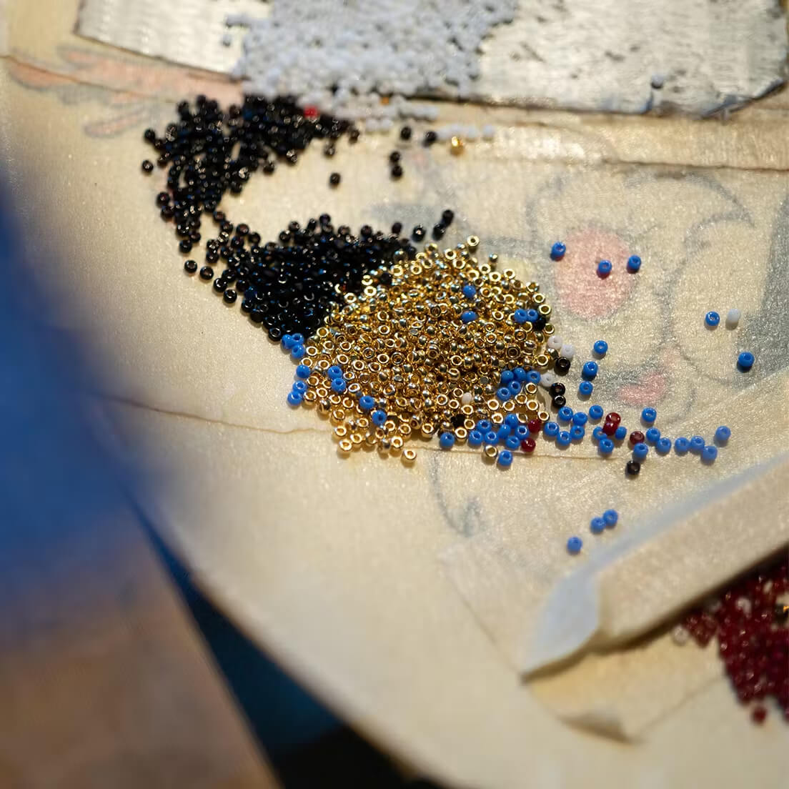 Francisco refers here to the hand-beaded temple adornments he produces for The Last Frontier, a special limited-edition collection by luxury eyewear designer Jacques Marie Mage. Each hand-beaded sleeve takes two hours to create, a delicate process that begins with stringing a custom loom using three different-sized nylon threads to stabilize and hold the integrity of the beadwork, with a fourth thread used to apply the beads.