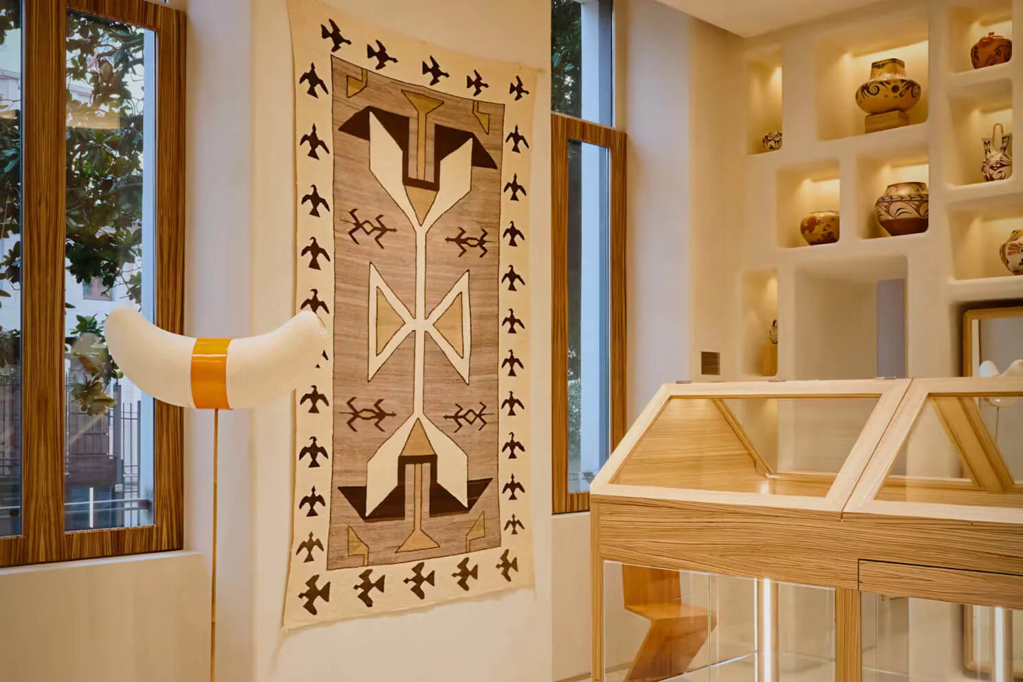 As with all JMM Galleries, a defining feature of the Milan location is its foundational furnishings, a suite of custom creations produced by Paris-based furniture design firm, Hervet Manufacturier, to bring a sense of tradition, prestige, and optimism to the décor. Handcrafted using rare woods, the furniture’s organic feel and unique shapes comfortably complement the gallery’s many museum-quality displays of authentic Indigenous art and craftworks, including a responsibly sourced collection of beaded leather moccasins and Navajo and Acoma pottery.