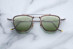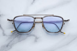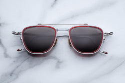 A charismatic ‘90s-inspired pilot handcrafted from 100% beta titanium, featuring a distinctive top bar, acetate lens-rim inserts, sleek temples with refined hairline details, and our signature hand-painted epoxy temple tips. Accompanied by custom leather eyewear straps.