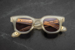 Iconic Panto-shaped spectacles handcrafted from plant-based acetate, featuring our signature sterling silver arrowhead front pins, silver palladium-plated temple ornaments with Lone Mountain turquoise inlays set within rectangular bezels featuring subtle Dinè (Navajo) design details, custom wirecores with traditional T’iis Názbas weaving pattern and tufa-stone texture details, and Morning Star medallions at the temple-tips.