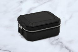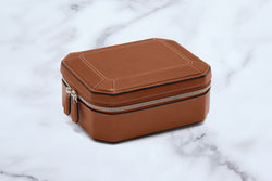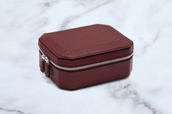 Handcrafted in Italy from responsibly sourced natural calfskin, this soft yet structured travel companion is defined by a chamfered silhouette that recalls both a jewel box and a modern reliquary, one that features a custom double-zippered lid, refined stitching, and hand-painted edges. Within, custom Suede Kidskin linings in our signature Bordeaux Empire color provide a sumptuous resting place for your collectibles. Available in small, medium, and large sizes capable of carrying three, six, or eight spectacles, respectively.