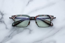 - Silver engraved titanium temples with acetate tips silver tension-secured custom arrowhead monoblock hinge pattern cellulose acetate custom nose pad with logo and hairline engraving light green cr39 4 base lens with backside anti-reflective treatment