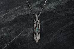 From the Last Frontier, this limited-edition arrowhead pendant necklace in Burnished Sterling Silver features distinct Art Deco details and a stunning cabochon of Blackjack Turquoise.