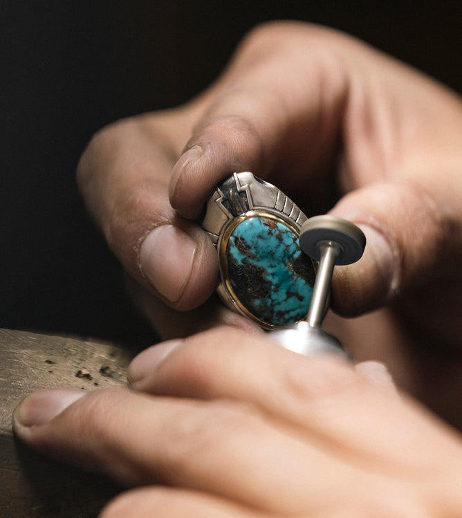 Proudly presenting a special collection produced in partnership with Dinè (Navajo) and Ute artist Bo Joe, whose contemporary approach to tufa casting, silversmithing, and turquoise inlay has made him one of the most compelling Native American jewelry artists working today. Handcrafted in limited editions, this collection of eyewear, jewelry, and accessories combines JMM’s exemplary craftsmanship with the cultural narratives and material mastery that defines Bo Joe’s artistic practice.